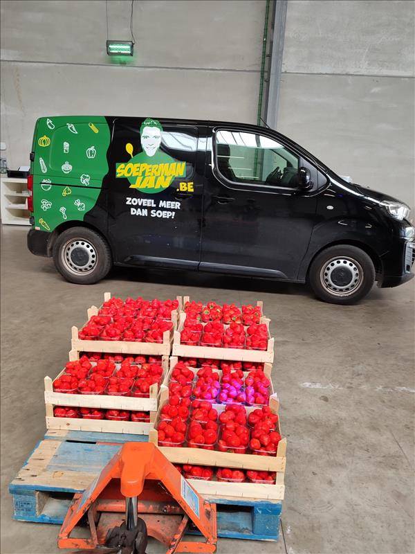 Om de 2 dagen transformeert de soepmobiel in de namiddag eventjes in de fruitmobiel. We gaan dan verse aardbeien halen bij de aardbeienboer op Tervenen. We zetten thuis nog een deksel op de potjes en de rode zoetjes zijn klaar om te verkopen in onze foodautomaten. Om de 2 dagen kan de dagprijs dus ook verschillen aangepast aan de inkoopprijs.